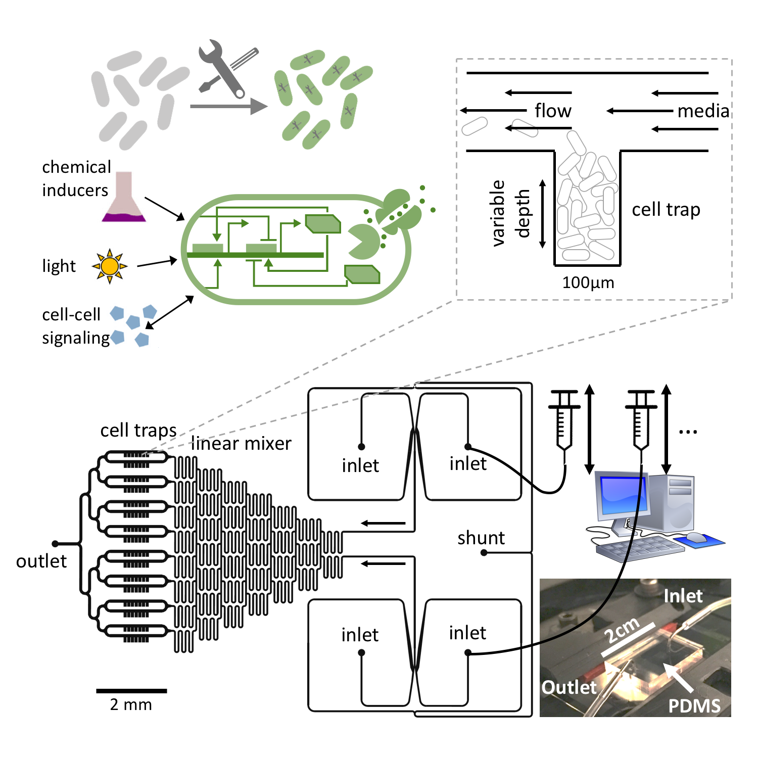 Bacteria like E. coli can be equipped with synthetic gene regulatory networks that either mimic behavior seen elsewhere in nature or provide entirely new functionality. A plethora of synthetic regulatory modules have been developed over the past two decades which enable the construction of more and more complex artificial cellular dynamics (see our recent review). In nature, bacteria exhibit a range of different self-organization phenomena as a result of environmental feedback processes (mechanical interactions, chemical transport, etc) interacting with biological processes such as gene regulation, growth and metabolism. Therefore, the tools of synthetic biology, in conjunction with experimental techniques such as microfluidics, present a unique opportunity to perturb or control both physical and biological ingredients of these complex interactions and study the self-organization of living systems.
